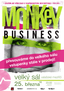 Také v tomto roce se fanoušci mohou těšit na koncertní turné nezdolně optimistické, neodolatelně sympatické a bezkonkurenčně roztomilé hudební skupiny Monkey Business. V plné zbroji, vybělenými zuby, odsátým tukem, titanovými hlasivkami a navíc posíleni dvěma perfektními Hammondovými varhanami se rozhodli potěšit fanoušky po celé republice. Jarní část turné čítá na dvaadvacet koncertů, z nichž polovinu má již kapela za sebou. Díky velkému zájmu fanoušků se koncert ve Valašském Meziříčí stěhuje z prostor M-klubu o dvě patra výš do velkého divadelního sálu. Počet vstupenek v předprodeji byl navýšen a k dostání by měly být také na místě. Zatím těžko říct jestli se hlavního ženského partu ujme Tonya Graves nebo Tereza Černochová, každým coulem to bude stát za to, neboť mají ve Valmezu početné publiku.