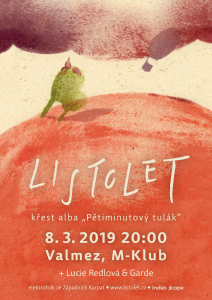 Listolet opustil své kotviště v Brně a rozlétl se po celé Moravě. Někteří z jeho členů se usídlili v okolí Valmezu, a není proto překvapením, že se novou desku Pětiminutový tulák rozhodli pokřtít také ve valašskomeziřícském M-klubu. Deska vychází v únoru a dorazí tedy do M-klubu velice čerstvá. Listolet se vrací k pravidelnému koncertování po dvouleté pauze, během které vzniklo mnoho nového repertoáru. Své síly ten večer spojí se starou známou, se kterou se potkali na nejednom pódiu, Lucií Redlovou. Tato hrdě valašská písničkářka, jejíž věhlas dalece přesahuje hranice Východní Moravy, vystoupí se svou kapelou Garde.