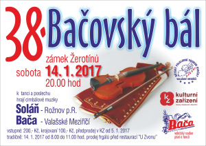 Valašská soubor písní a tanců Bača a Dětský folklórní soubor Ovečky pořádají již 38. ročník Bačovského bálu, který se po dvou letech opět vrací do prostor Kulturního zařízení ve Valašském Meziříčí. Bačovský bál zde zahájí plesovou sezónu v sobotu 14. ledna od půl osmé večerní a bude se rozprostírat ve velkém sále v prostorách divadelní kavárny. K tanci a poslechu zahraje Cimbálová muzika Bača a Cimbálová muzika Soláň. Od osmé do dvanácté hodiny dopolední se ten den před restaurací U Zvonu uskuteční tradiční prodej frgálů. Předprodej vstupenek je zahájen ve středu 4. ledna 2017 a jsou k dostání v Turistickém informačním centru ve Valašském Meziříčí a online na stránkách Kulturního zařízení www.kzvalmez.cz.
