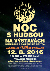Muzejní a galerijní centrum ve Valašském Meziříčí, sídlící v jižním křídle zámku Žerotínů připravuje na pátek 12. srpna program Noc s hudbou na výstavách MaGC. Návštěvníci si mohou přijít na I. nádvoří zámku, respektive do přízemí Muzejního a galerijního centra, poslechnout místní kapelu Vagaband. Přímo v prostorách výstav pak bude atmosféru dokreslovat DJ Fast Forward.