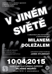 Na cestu mezi paranormálními a nevysvětlitelnými jevy se mohou vydat návštěvníci Kulturního zařízení společně s odborníkem přes hermetismus a paranormální jevy Milanem Doležalem. Ten ve Valašském Meziříčí uvede jedinou talk show zaměřující se na regionální záhady nazvanou V jiném světě v pátek 10. dubna ve velkém sále od osmnácti hodin. Vstupenky jsou již v prodeji.