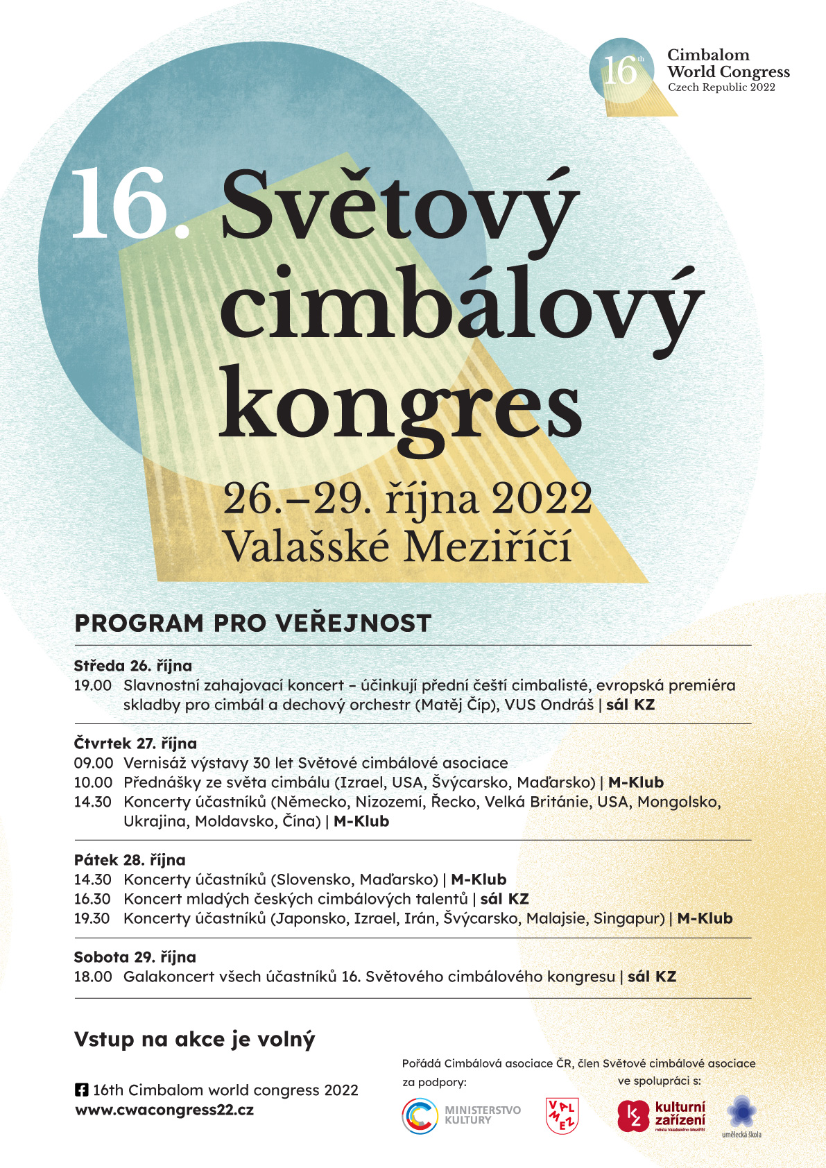 Koncem října, ve dnech 26. – 29. října 2022 se uskuteční ve Valašské Meziříčí 16. Světový cimbálový kongres. Od posledního kongresu, který byl pořádán v České republice, konkrétně v roce 1993 v Brně a ve Strážnici, uběhlo již 29 let. Letošní ročník bude návštěvníky této velké události hostit město Valašské Meziříčí a pro konání programu propůjčí své prostory KZ v zámku Žerotínů.