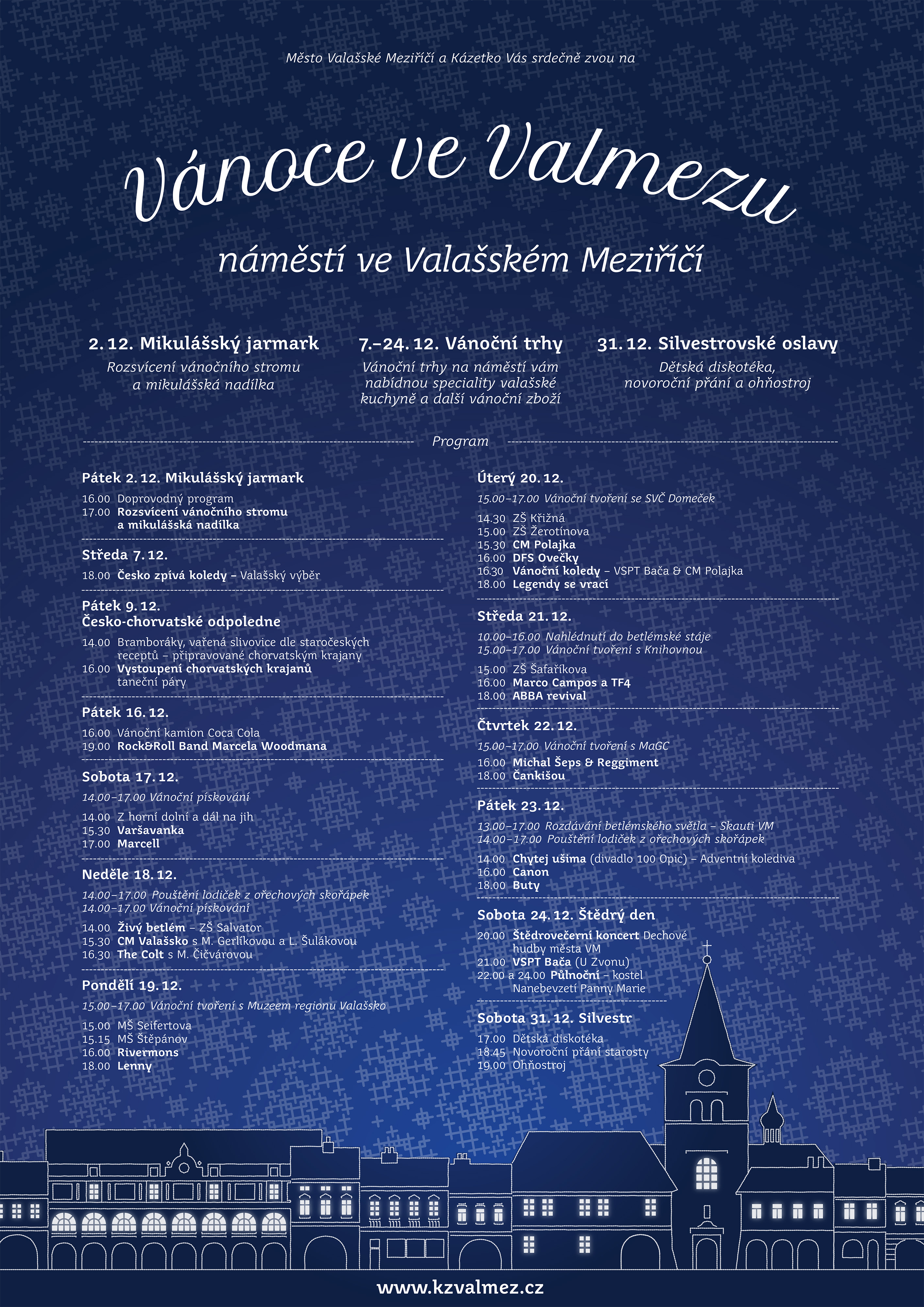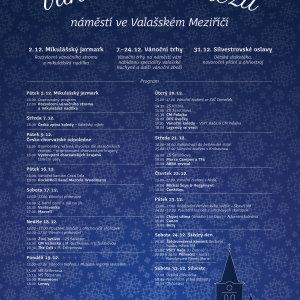 Město Valašské Meziříčí vás srdečně zve na Vánoce ve Valmezu, nejkouzelnější období roku. Město se oblékne do adventního a vánoční atmosféra na náměstí potěší každého návštěvníka. Přijďte se podívat a nadechnout se příjemné sváteční atmosféry s bohatým doprovodným programem.